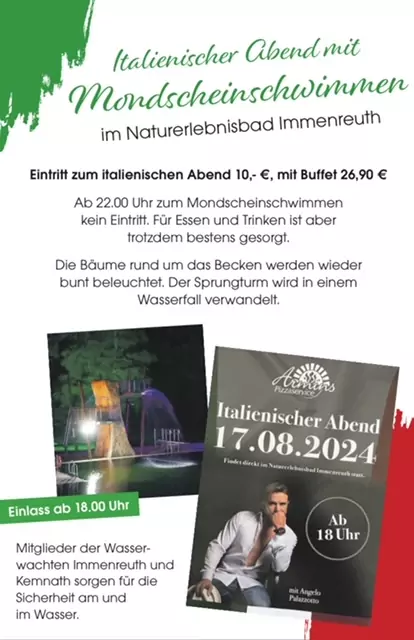 Die Naturerlebnisbad im Kemnather Land GmbH und Armin Kastl, Kioskbetreiber des Freibades, legen das Mondscheinschwimmen und den Italienischen Abend erstmals zusammen. Auftakt ist diesen Samstag, 17. August, um 18 Uhr mit dem Italienischen Abend im Biergarten innerhalb des Badgeländes. Neben einem landestypischen Buffet, unter anderem mit Bruschetta, Tiramisu, Nudelgerichten, Pizzen und Salatbar, sorgt Angelo Palazzotto für mediterranes Flair. Der Live-Musiker aus Waldsassen unterhält mit Liedern von Eros Ramazzotti, Ricky Martin, Semino Rossi, Bryan Adams, Michael Jackson, aber auch Luciano Pavarotti. Der Eintritt zum Italienischen Abend kostet 10,00 €, mit Buffet 26,90 €.